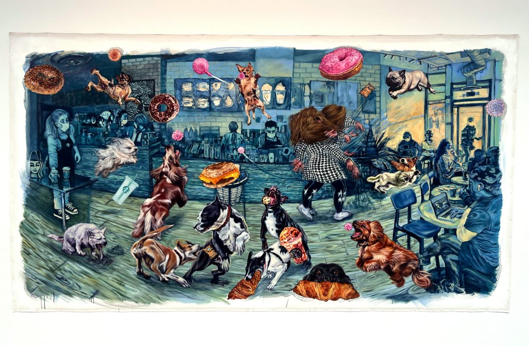 Shifting from this common idea of Rage and Ecstasy through “Karens,” Yun begins to portray this idea through dogs instead, and a lot of dogs at that. She strays from her typical portraiture of “Karens” pulled from real life videos and scenes that are scattered throughout the exhibit, aiming to depict more direct, understandable chaos rather than the unjust rage of a single unstable woman from a viral video. In Houndstooth, Yun created her own scene based on the idea of “Starbucks Karens” and emphasizes the idea of narcissistic engagement. We are meant to imagine ourselves as the dogs in this scenario. We are doing what is seemingly best for only ourselves. We as humans have an instinct to fetch after what we want, even if it isn’t good for us. We can relate to dogs in that sense. If what we catch can fill an empty void within ourselves, it doesn’t matter the chaos it takes to get there, and it doesn’t matter the repercussions it holds. Yun described her use of dogs as a gentrification symbol as well: are we domesticating the dogs, or is it the other way around? Are they actually controlling us? By keeping in touch with our animalistic instincts, we always strive to get what we want, what is fulfilling, what is sweet, and what is detrimental to our bodies. Each of the dogs are meant to represent the human condition and how we can unleash chaos, or rage, to achieve ecstasy. In this image, both Rage and Ecstasy are clearly shown. The dogs are feral, itching for something to relieve their hunger. Some dogs are experiencing the crash for indulging so heavily in something that isn’t good for them, such as the dog throwing up in the piece. The people in the back pay no mind because they aren’t meant to represent us, but the dogs are. We engage in Rage and Ecstasy to fill our own needs, yet we pay no mind to the possible repercussions of such. Similarly, we watch these “Karen” videos, laughing and being entertained by the misery of a random woman, thus fueling the cycle even harder and provoking the women to react once again, just for us to watch the recording and laugh once more.