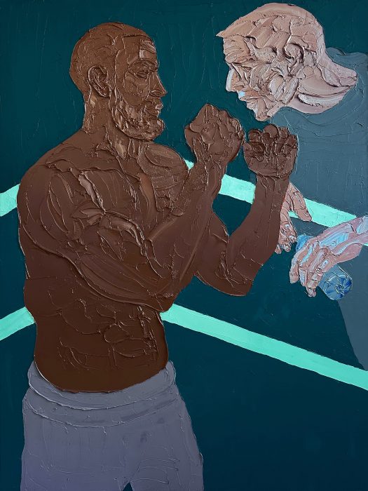 In this piece entitled That Time Away From Family; Abraham Nova and coach Mark Deluca (2024), Masha Keryan begins her series with a touching scene between boxer Abraham Nova and his coach Mark Deluca, the first two people she ever met at the boxing gym. After watching her very first live boxing match at the World Junior League at Madison Square Garden, Keryan felt inspired to begin her series, basing it on the tension, dedication, and the drive that she felt from watching boxers fight. She notes that once a boxer enters the ring, you can see through their moves exactly what they are made of, whether it be fear or confidence. The ring is an extremely vulnerable state to be in, and she found this to be an especially touching source of inspiration. In this scene specifically, Keryan describes that fighter Abraham Nova was about to enter his final round, and coach Mark Deluca said something to him that stuck with her: he said “think of all that time you have spent away from your family,” being the title of the piece. This statement was extremely touching to not only Nova, as he has ten siblings and extremely values his family, but Keryan as well, as she can relate to being very close with her family, and finding that pursuing her painterly career both physically and philosophically restricts her from seeing her family as often. Family is extremely important to many, including them, and time away from family can be seen as the biggest sacrifice. She notes that Deluca and Nova had a very intriguing work dynamic to watch, as they seemed to operate as one vessel. Deluca trains every single one of the boxers depicted in her series, and Keryan wanted to show off Deluca’s dedication and skills in community building along with what she has personally taken from watching each fight she has seen in real life (persistence, faith, dominance; the names of the other pieces). Deluca currently runs a non-profit gym, encouraging young students to join and train. Keryan emphasises that boxing is very much a life saver for young boys, and applauds Deluca for his work in community engagement and teaching for young students.